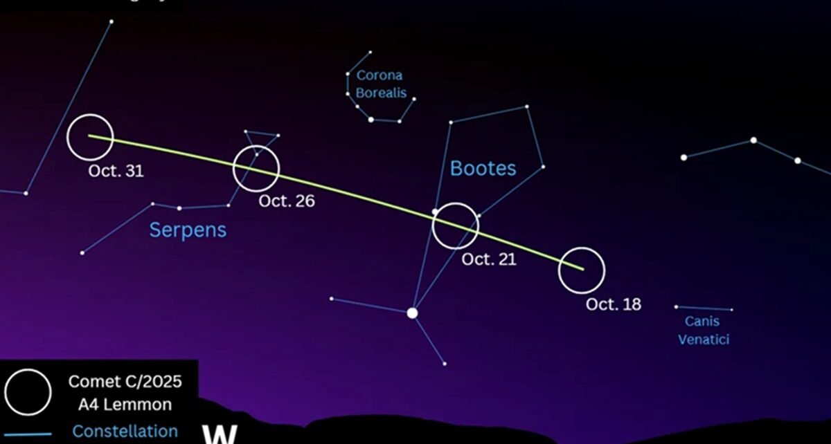 Koranriau.co.id- Komet Lemmon (C/2025 A6) akan melintasi konstelasi Serpens Caput pada 26 Oktober malam. (Anthony Wood in Canva) KOMET Lemmon (C/2025 A6) akan melintasi bagian leher konstelasi Serpens Caput, atau “kepala ular”, pada Minggu (26/10) malam waktu Amerika Serikat, sebelum mendekati Matahari di awal November. Fenomena langka ini dapat diamati langsung dari Bumi, terutama dari lokasi […]